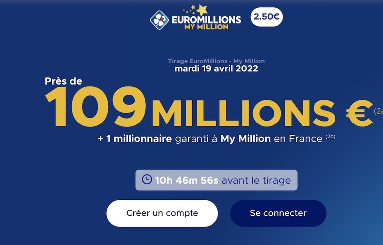 LEuroMillions affiche 109 millions deuros ce mardi 19 avril 2022. EuroMillions-My Million cest 2 tirages par semaine à 17 000 000 deuros minimum. Vous cherchiez les résultats dun autre loto à cette date.